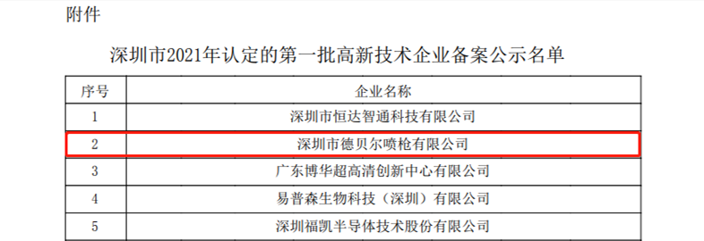 新年伊始,喜事连连!近日,高新技术企业认定管理工作网发布了《关于对深圳市2021年认定的第一批高新技术企业进行备案公示的通知》和《关于对广东省2021年认定的第三批高新技术企业进行备案公示的通知》,深圳市德贝尔喷枪有限公司、德贝尔佛山分公司凭借出色的创新能力及强大的科研实力,通过国家高新技术企业认定。